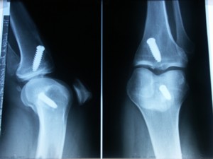 Santé Le genou de Josette est entré en collision avec la tête de Sylvestre. Le médecin craignait une fêlure, mais ce n'est heureusement pas le cas; il y a quand même un hématome et un épanchement pré-rotulien (ce n'est pas pédant, c'est précis). Sur la radio ci-dessous, les vis sont celles de l'opération des ligaments croisés d'il y a deux ans.