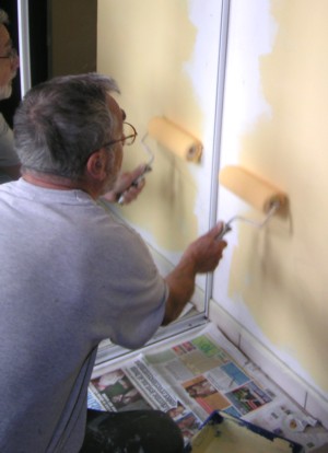 Nous avons détapissé le hall, puis nous l'avons repeint. Josette est en train de refaire les portes. Sur la photo, on peut voir que je peins à deux mains, pour aller plus vite.