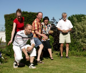 Ici, je suis en train de lui dérégler son GSM (je l'ai mis en russe). 5/6 Nous avons été invités à Cul-des-Sarts, pour l'anniversaire de Jean-Claude. Nous y avons montré notre bonne éducation, en laissant les autres gagner à la pétanque.