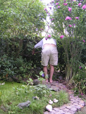 Nous avons récupéré des pavés de la rue pour améliorer le pourtour de l'étang (6/8).