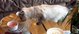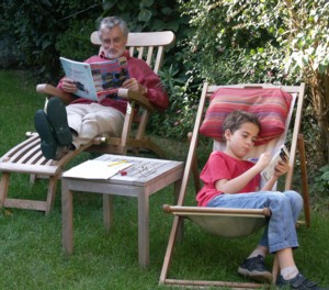 Comme nous manquions de chaises, nous avons emprunté des poufs à Andrée; les chats ne veulent pas les lui rendre.
