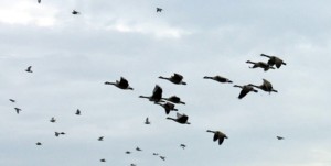 J'ai essayé de photographier les dizaines d'oies qui se préparaient à migrer, dans un champ près de chez nous. Ces sales bêtes sont fainéantes (elles ne veulent pas voler), sourdes (il n'y a pas moyen de leur faire peur) et peu coopérantes (elles s'éloignaient de moi quand j'essayais de les approcher). J'ai quand même réussi à faire ceci:
