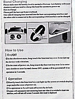 Zoo Cléo en pension chez nous, pendant les courtes vacances d'Anne en Espagne. (14/9) J'ai offert un "bracelet connecté" à Josette. Il donne l'heure (et la date), le nombre de pas parcourus (et la distance), le nombre de calories consommées, le rythme cardiaque (ce qui me permettra de vérifier qui, de George Clooney, Matthias Schoenaerts, Koen De Bouw, Jean Dujardin, ... fait battre son coeur plus vite), la tension artérielle (euh ...), l'analyse du sommeil (mais ça n'a pas l'air de fonctionner), et il avertit en cas d'appels ou de SMS sur le smartphone (ça ne fonctionne pas non plus). Le premier problème a été de le charger. Le vendeur m'avait affirmé qu'il y avait un câble pour cela, mais c'est faux. Il faut détacher le bracelet de l'appareil (sans avoir peur de l'arracher!), choisir l'embout qui est une prise USB (c'est celui avec des contacts), et deviner dans quel sens le brancher. Ca ne sert à rien de consulter le mode d'emploi, qui est quasi-illisible (la photo ci-dessous le montre dans ses dimensions réelles), et ce qui est lisible est incompréhensible.
