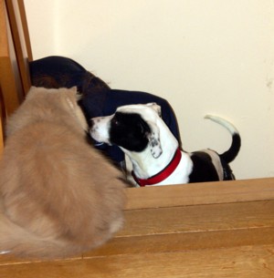 Ca a été beaucoup plus compliqué avec Sylvestre. Il s'est enfui instantanément, et a disparu pendant 1 jour et 2 nuits. Il est quand même rentré manger, et est allé se réfugier dans notre chambre. Maintenant, il passe toujours assez loin d'elle, mais il l'observe d'un air intrigué. Il revient mendier à table, même quand Fifa est dans le salon.