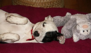 Il s'agit d'une femelle American Staff (d'après A.en P), sérieusement mâtinée de Fox et de Dalmaltien. Elle a presque un an. Elle s'appelait Sleepy, mais a été rebaptisée Fifa. Parmi les noms auxquels elle a échappé (il fallait que ça commence par F): Fricadelle, Frigolite, Falusse (ça ne convient pas: c'est une femelle), Flébite (idem), Filosofille, Fenistile, Fanchon, Fanfreluche, Fébrèze, Fritkot, Fishstick, Frangipane, Fadaise, Forza, Faucheton, Foulcamp, Filactère, Filoxera, Farweste, FGTB, Fofolle, Ficelle, etc. Anne a aussi rencontré tous les chats d'A.enP.