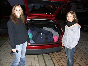 Anne a passé une semaine de stage (avec sa classe de l'ISALT) à Blankenberge. Ici, elle a terminé de mettre des valises dans la voitures, et Amandine se demande où elle va bien mettre ses propres bagages. Nous ne savons toujours pas comment la troisième passagère a voyagé.